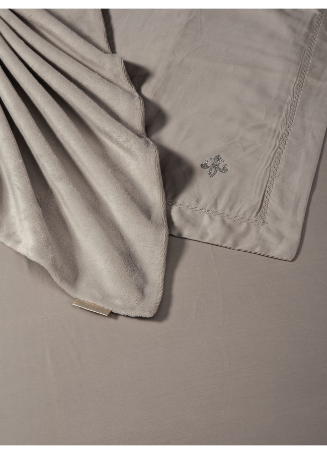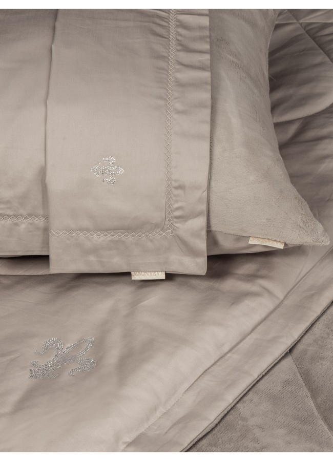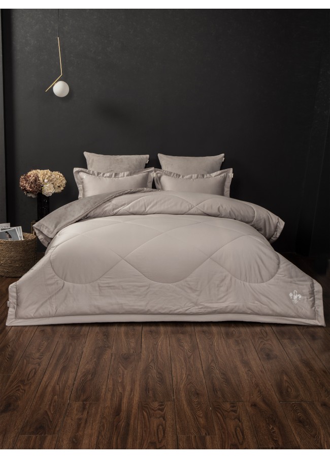Коллекция Premium сегмента, постельное белье с одеялом «Lindor Fluffy». Двухстороннее одеяло: прохладный египетский хлопок и роскошный премиум-велюр, украшен элегантной стежкой. Комплект идеально подойдет для любителей поспать под кондиционером, велюровая сторона приятно окутает тело, сторона с египетским хлопком предназначена для любителей естественной прохлады в жару. Украшена геральдической лилией, выполненной из высококачественных страз. Двухсторонняя наволочка 50х70 декорирована геральдической лилией из страз. Наволочки 70х70 выполнены из комбинации нежного велюра и египетского хлопка. Простынь выполнена из египетского хлопка. Размерный ряд: евро, семейный. Доступные цвета: лаванда платина, серый беж, лайт пудра, карамель, крем, капучино трюфель, платина беж, графит. Комплекты изящно выложены в Брендовую подарочную упаковку «KAZANOV.A.».
