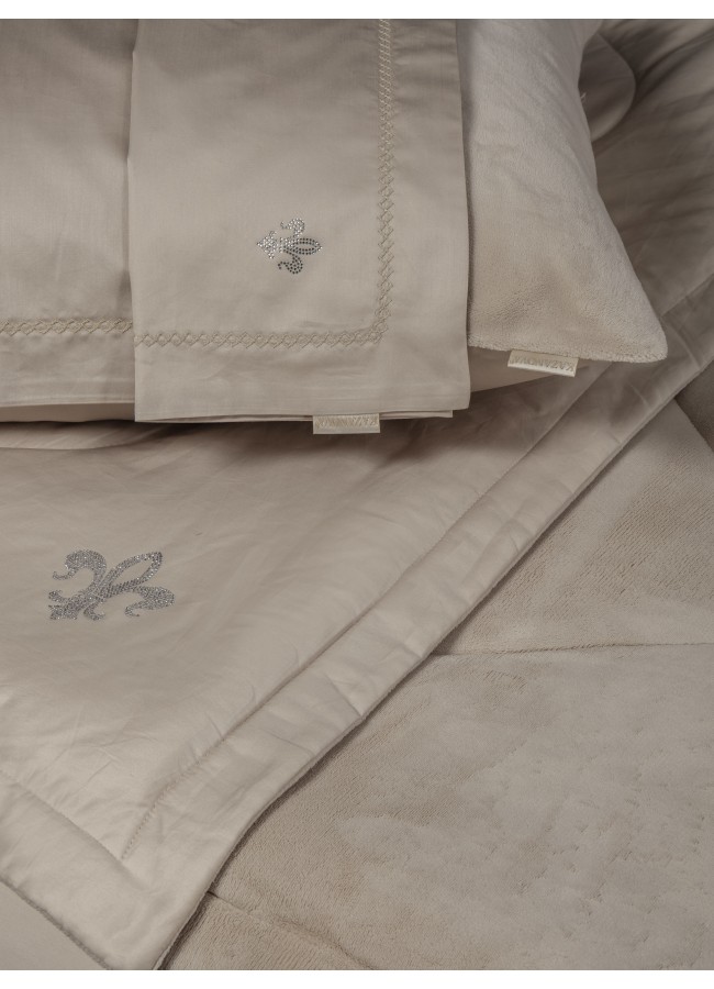 Коллекция Premium сегмента, постельное белье с одеялом «Lindor Fluffy». Двухстороннее одеяло: прохладный египетский хлопок и роскошный премиум-велюр, украшен элегантной стежкой. Комплект идеально подойдет для любителей поспать под кондиционером, велюровая сторона приятно окутает тело, сторона с египетским хлопком предназначена для любителей естественной прохлады в жару. Украшена геральдической лилией, выполненной из высококачественных страз. Двухсторонняя наволочка 50х70 декорирована геральдической лилией из страз. Наволочки 70х70 выполнены из комбинации нежного велюра и египетского хлопка. Простынь выполнена из египетского хлопка. Размерный ряд: евро, семейный. Доступные цвета: лаванда платина, серый беж, лайт пудра, карамель, крем, капучино трюфель, платина беж, графит. Комплекты изящно выложены в Брендовую подарочную упаковку «KAZANOV.A.».