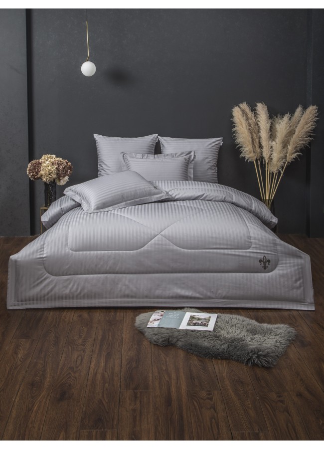 Stripe Royal от KAZANOV.A. Чистота формы. Совершенство линий. Stripe Royal — премиальная коллекция постельного белья со стёгаными одеялами: современное звучание классики в эстетике KAZANOV.A. Stripe Royal из 100% египетского хлопка — как клавиши рояля, собранные в изысканную мелодию спальни. Здесь есть тонкая игра света и тени: полосы ведут взгляд и настраивают на баланс и гармонию погружая в королевский сон. Рисунок стежки вторит этому звучанию и завершает архитектуру образа. Отделка задаёт характер: ? Ювелирная подпись Fleur-de-Lis из высококачественных страз — на одеяле и наволочках 50?70 ? Стёжка одеяла - функциональная эстетика ? Декоративная вышивка по ушку наволочек 50*70 Состав и материалы: ? Ткань комплекта: 100% египетский хлопок, страйп-сатин ? Наполнитель одеяла: 100% эковолокно Микрогель — лёгкий, гипоаллергенный, с равномерным распределением тепла и комфортной терморегуляцией. Монохром в нюансах: ? капучино ? пыльная роза ? платина ? бежевый крем ? серебро ? графит ? ниагара Комплектации: ? Евро: одеяло 200?220 (1) наволочки 50?70 (2) наволочки 70?70 (2) простыня 245?260 (1) ? Семейное: одеяло 155?210 (2) наволочки 50?70 (2) наволочки 70?70 (2) простыня 245?260 (1) ? Полуторное: одеяло 155?210 (1) наволочка 50?70 (1) наволочка 70?70 (1) простыня 160?220 (1) Уход: ? деликатная стирка при 30 °C ? легко стирается и быстро сохнет Упаковка: ? дизайнерская коробка KAZANOV.A.; выкладка Handmade подчёркивает статус коллекции и делает её безупречным подарком Текстильная продукция KAZANOV.A. — эталон качества и верность традициям!