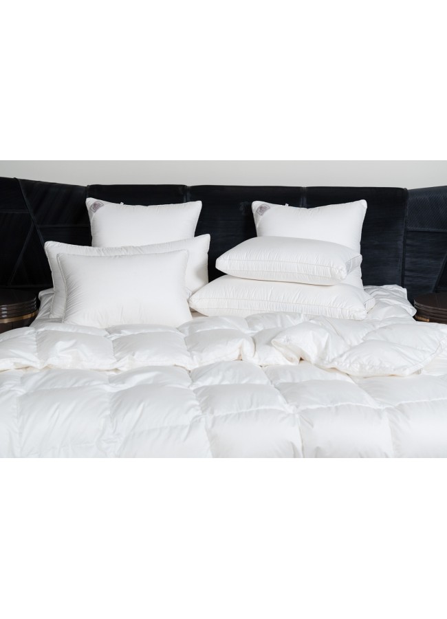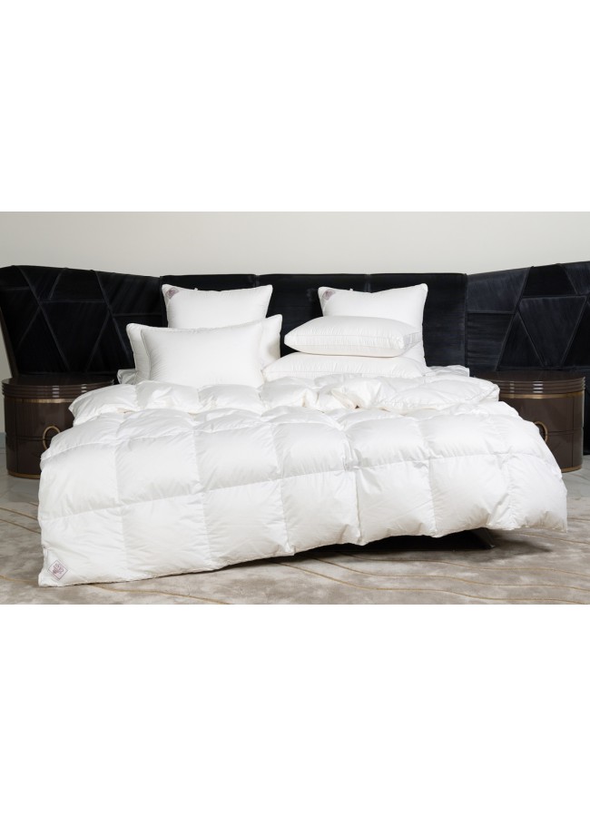 Немецкий хлопковый сатин высочайшей плотности соткан из тончайших нитей (Premium Satin - Nе 120/120 493 ТС) и прошел финишную обработку SanProCare® Sensitive, обеспечивающую усиленную гигроскопичность и придающую ей «пуховую мягкость». Особо тонкий, мягкий и «нешуршащий» чехол обладает повышенной износостойкостью и предотвращает проникновение пылевых клещей внутрь изделий. Наполнителем служит пух высочайшего качества, отобранный на гусиных фермах Сибири, которая, по утверждению биологов, является зоной проживания гусей, носящих пух максимально больших размеров, что, безусловно, влияет на пуховую массу положительно и наполнитель имеет повышенный коэффициент упругости (Fill Power), достигающий значений в 850 ед.
