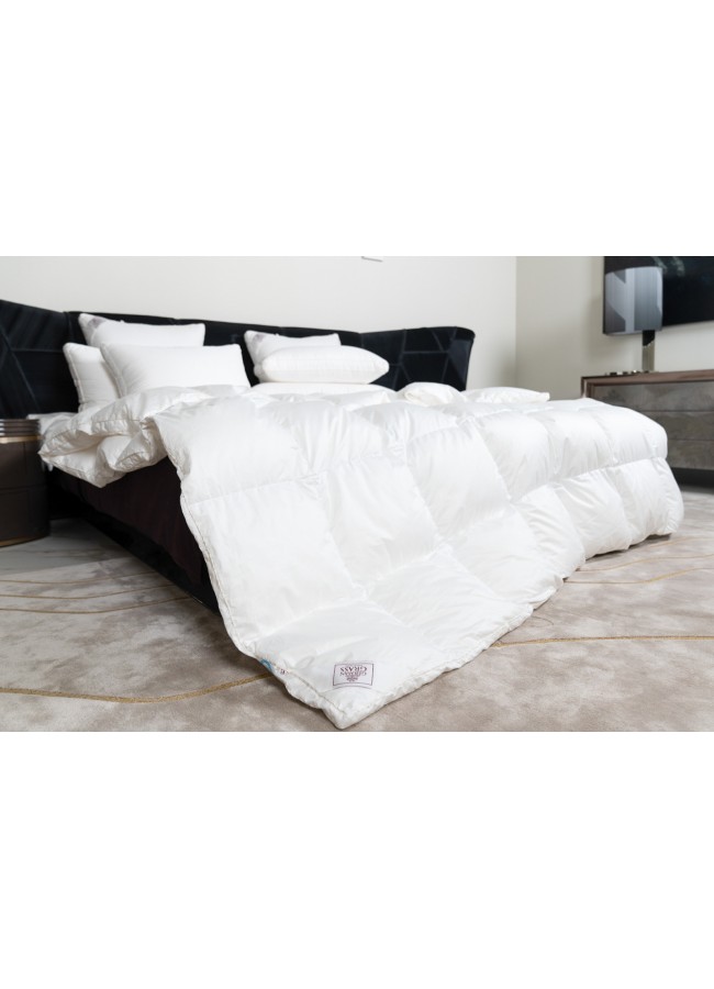Немецкий хлопковый сатин высочайшей плотности соткан из тончайших нитей (Premium Satin - Nе 120/120 493 ТС) и прошел финишную обработку SanProCare® Sensitive, обеспечивающую усиленную гигроскопичность и придающую ей «пуховую мягкость». Особо тонкий, мягкий и «нешуршащий» чехол обладает повышенной износостойкостью и предотвращает проникновение пылевых клещей внутрь изделий. Наполнителем служит пух высочайшего качества, отобранный на гусиных фермах Сибири, которая, по утверждению биологов, является зоной проживания гусей, носящих пух максимально больших размеров, что, безусловно, влияет на пуховую массу положительно и наполнитель имеет повышенный коэффициент упругости (Fill Power), достигающий значений в 850 ед.
