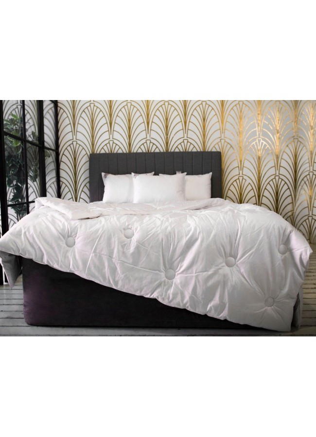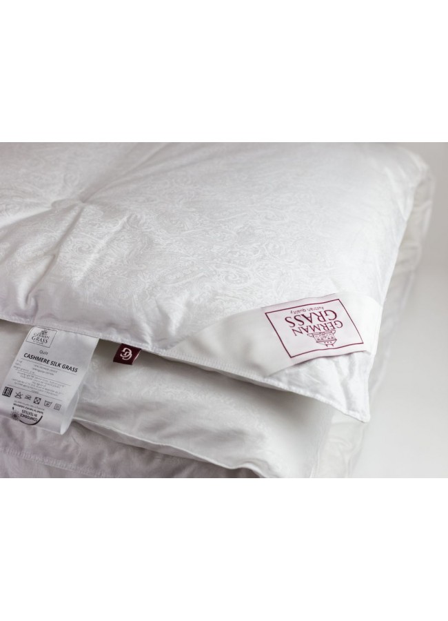 Лимитированная коллекция теплых стеганых одеял производится полностью вручную по sandwich-технологии. Сложносоставной наполнитель, в котором слои расположены в порядке Silk - Cashmere - Silk, находится внутри чехла из жаккардового пуходержащего хлопкового NOBLESATEEN, созданного на фабрике Weidmann GmbH в Германии. Это - эксклюзивное сочетание, где шерсть кашмирских коз выступает теплоизолянтом, а шелковый пласт отводит излишнее тепло, не позволяя создавать дискомфорт. Ткань из специального гидрофильного хлопка поглощает влагу и препятствует миграции наполнителя наружу. Коллекция Cashmere Silk Grass дает возможность ценителям изделий из натурального шелка использовать эти одеяла в холодное время года с максимальным комфортом. Как и всякий эксклюзив, изделия этой коллекции требуют особого ухода при обслуживании и не должны использоваться с постельным бельем, содержащим синтетические нити. Стирка не рекомендована, допускается только сухая чистка изделий.