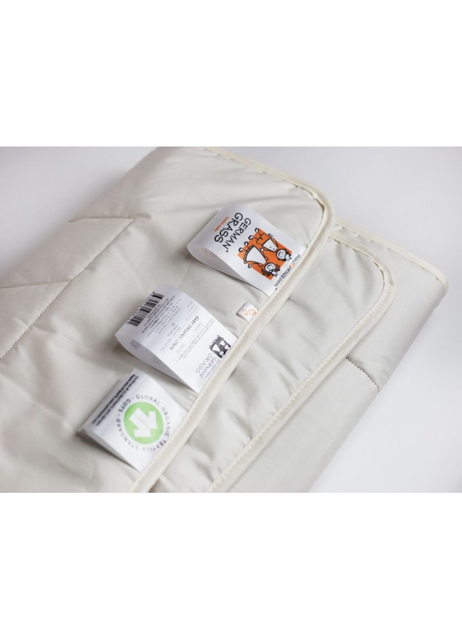 В изделиях коллекции объединены общемировые тенденции применения экологичных материалов. Органический хлопок собирается вручную и выращивается без использования пестицидов и искусственных удобрений. Волокно не обработается соединениями хлора, оптическими отбеливателями или хлорированными углеводородными соединениями. Каждый этап производства контролируется по требованиям создания 100% органических продуктов. Ткани, сертифицированные по "Global Organic Textile Standard", и натуральные волокна хлопка и льна - вот, что нужно, чтобы быть уверенным в отсутствии влияния техногенного мира на здоровье вашего малыша. Наполнитель из смеси натурального льна и хлопка обладает гипоаллергенным свойством, антибактериальным, биоцидным и антистатическим эффектами*. Он устойчив к внешним воздействиям, восстанавливает форму и принимает анатомическое строение тела. Гибкие и прочные пласты проходят многоступенчатую переработку и выдерживают многократные стирки в стиральных машинах. Это позволяет использовать изделия без постельного белья. Благодаря специальной эргономичной стежке, одеяло облегает тело малыша, а подушки изготовлены по технологии, обеспечивающей правильное положение головы ребенка. Рекомендована стирка при температуре до 30°С.
