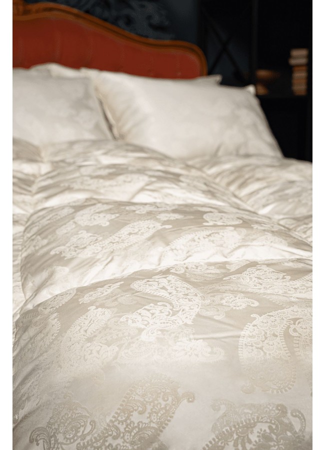 Сочетание сливочного пуходержащего жаккардового сатина PAISLEY из натурального 100% шелка и первоклассного пухового наполнителя категории "Экстра" повышенной упругости (Fill Power не менее 850 ед.) - это совершенный эксклюзив в мире постельных принадлежностей. Высокая плотность ткани и двойная отстрочка не позволят пуху мигрировать из изделия и не пропустят частички пыли внутрь. Эксклюзивные ткани создаются на единственном производстве в Европе - старейшей немецкой ткацкой фабрике - в лимитированном количестве. Для того, чтобы ткать шелковый пуходержащий жаккард с узором, необходимо обладать высочайшим уровнем мастерства. Кассетные одеяла ручной работы предназначены для использования в холодное время года. Каждая кассета размером 40х40 см наполнена отборным белым пухом вручную.Для обеспечения особых гигиенических свойств, изделия прошли обработку методом озонирования Ozone Pure 360 Grass. Как и всякий эксклюзив, изделия этой коллекции требуют особого ухода при обслуживании: мы не рекомендуем их стирать, допускается только сухая чистка изделий.