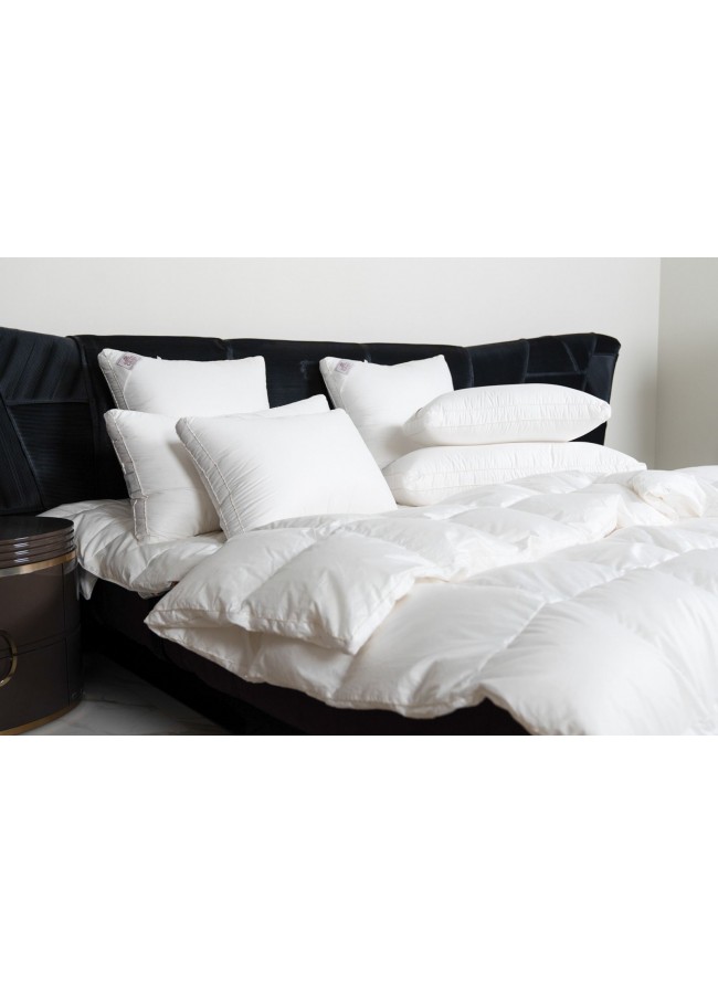 Немецкий хлопковый сатин высочайшей плотности соткан из тончайших нитей (Premium Satin - Nе 120/120 493 ТС) и прошел финишную обработку SanProCare® Sensitive, обеспечивающую усиленную гигроскопичность и придающую ей «пуховую мягкость». Особо тонкий, мягкий и «нешуршащий» чехол обладает повышенной износостойкостью и предотвращает проникновение пылевых клещей внутрь изделий. Наполнителем служит пух высочайшего качества, отобранный на гусиных фермах Сибири, которая, по утверждению биологов, является зоной проживания гусей, носящих пух максимально больших размеров, что, безусловно, влияет на пуховую массу положительно и наполнитель имеет повышенный коэффициент упругости (Fill Power), достигающий значений в 850 ед.