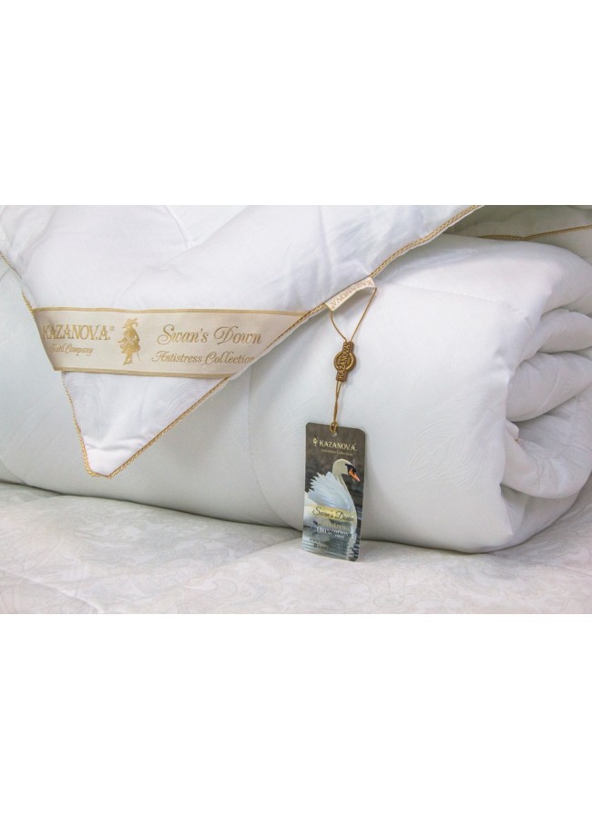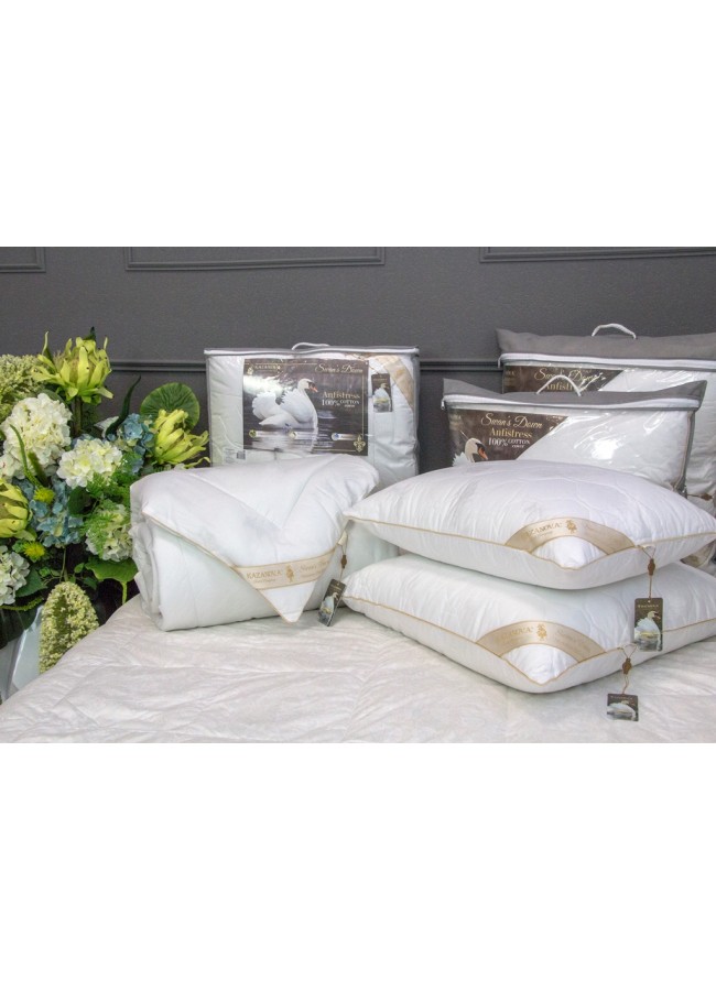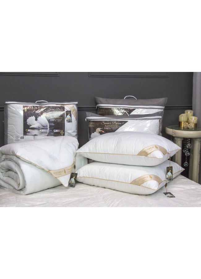 Коллекция Luxury Antistress Collection Swans Down. Мы создали для Вас уникальную коллекцию подушек и одеял как в дорогих отелях, по очень привлекательной цене. Чехол подушек и одеял полностью простеган и выполнен из жаккардового египетского хлопка. Наполнитель в чехле подушки: 100% микроволокно «лебяжьего пуха», благодаря чему подушка легкая и приятная в использовании. Наполнитель подушки и одеял 100% микрогель, обработанный ионами серебра. Элементами отделки служат: витой жаккардовый кант по всему периметру подушек и одеял, и шелковистая угловая лента с логотипом компании KAZANOV.A. Подушки представлены в двух размерах: 50х70; 70х70. Одеяла - 155х210; 200х220. Коллекция упакована в сумке с витыми шелковыми ручками, фотосессия прилагается.