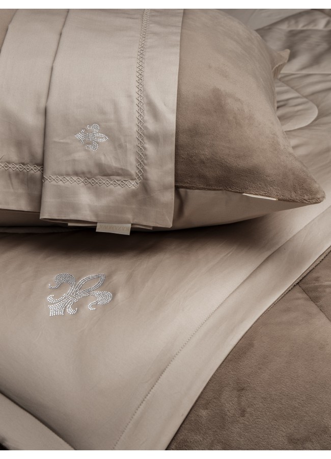 Коллекция Premium сегмента, постельное белье с одеялом «Lindor Fluffy». Двухстороннее одеяло: прохладный египетский хлопок и роскошный премиум-велюр, украшен элегантной стежкой. Комплект идеально подойдет для любителей поспать под кондиционером, велюровая сторона приятно окутает тело, сторона с египетским хлопком предназначена для любителей естественной прохлады в жару. Украшена геральдической лилией, выполненной из высококачественных страз. Двухсторонняя наволочка 50х70 декорирована геральдической лилией из страз. Наволочки 70х70 выполнены из комбинации нежного велюра и египетского хлопка. Простынь выполнена из египетского хлопка. Размерный ряд: евро, семейный. Доступные цвета: лаванда платина, серый беж, лайт пудра, карамель, крем, капучино трюфель, платина беж, графит. Комплекты изящно выложены в Брендовую подарочную упаковку «KAZANOV.A.».